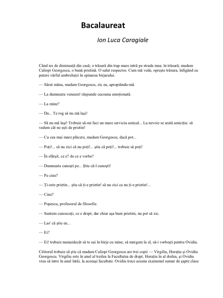 în trăsură madam Caliopi Georgescu o bună prietină. Bacalaureat schiță literară De la Wikipedia enciclopedia liberă. De ION LUCA CARAGIALE Într-o dimineaţă tocmai când pleca de acasă naratorului îi ieşi în cale madam Caliopi Georgescu.